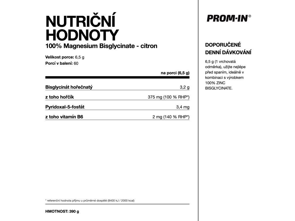 PROM-IN® 100% MAGNESIUM BISGLYCINATE – hořčík je zde navázán na dvě molekuly aminokyseliny glycinu – tato organická chelátová vazba vytváří stabilní komplex, který tělo rozpoznává podobně jako aminokyselinu.
