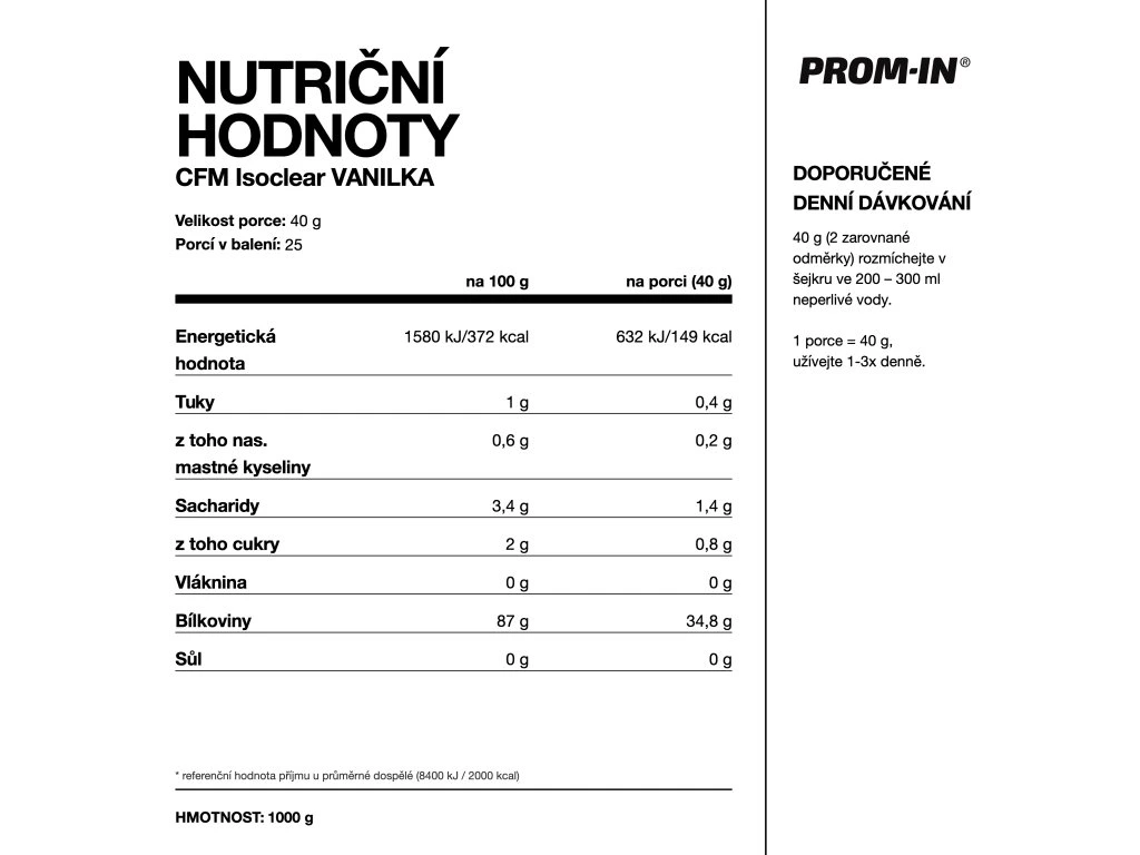 CFM Isoclear, PROM-IN® nabídne praktický zdroj rychle využitelné bílkoviny pro regeneraci, udržení svalové hmoty i každodenní doplnění proteinu v obdobích zvýšených nároků na příjem bílkovin.