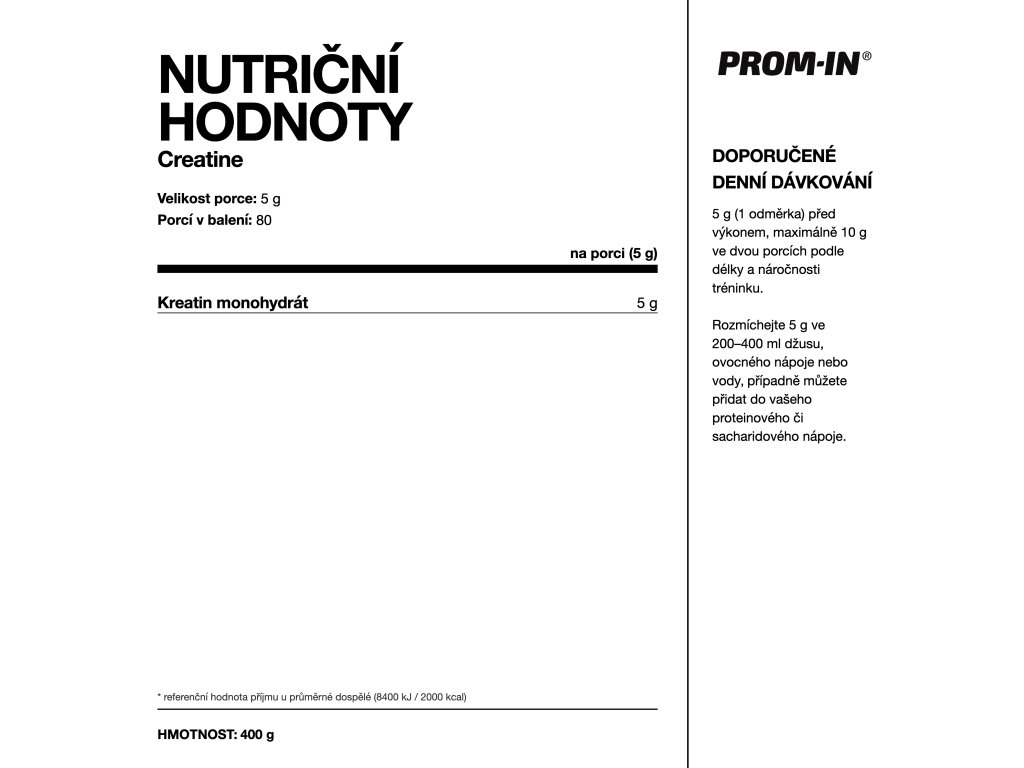 CREATINE PROM-IN® je 100% čistý kreatin monohydrát v mikronizované formě. Jde o základní formu kreatinu vyráběnou podle farmaceutické specifikace čistoty. Produkt je neochucený, bez příměsí a dobře se kombinuje s běžnou suplementací — ať už sportovní, nebo pro dlouhodobé udržení buněčné energie.