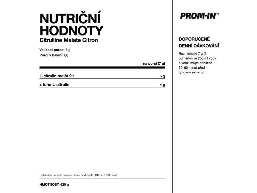 PROM-IN® CITRULLINE MALATE CITRON je doplněk stravy obsahující L-citrulin malát v poměru 2:1, ochucený jemnou citronovou příchutí.