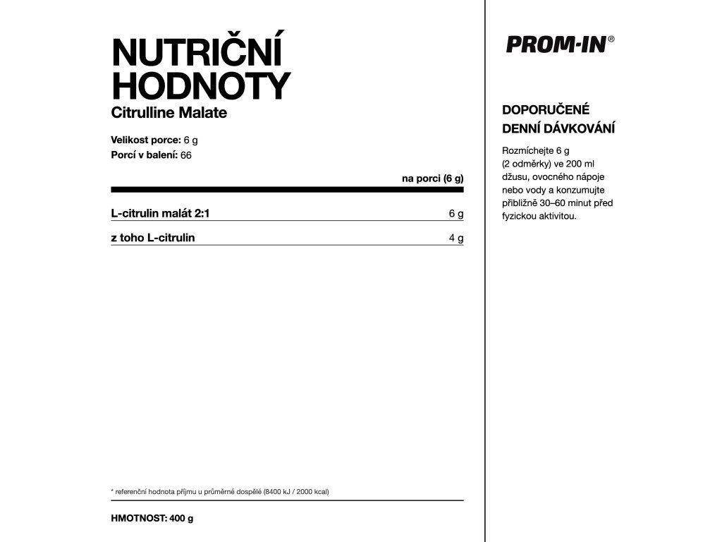 PROM-IN® CITRULLINE MALATE je doplněk stravy obsahující L-citrulin malát v poměru 2:1.