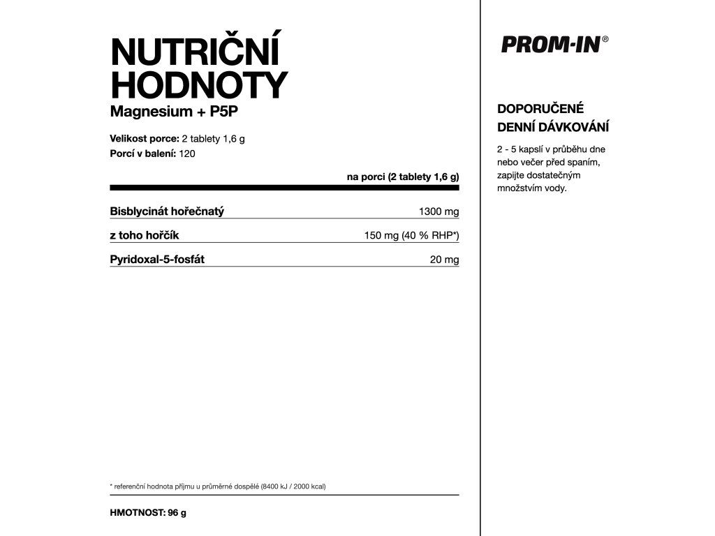 bisglycinát hořečnatý (nepufrovaný), želatinová tobolka, protispékavá látka: stearan hořečnatý; vitamin B6 (pyridoxal-5-fosfát)