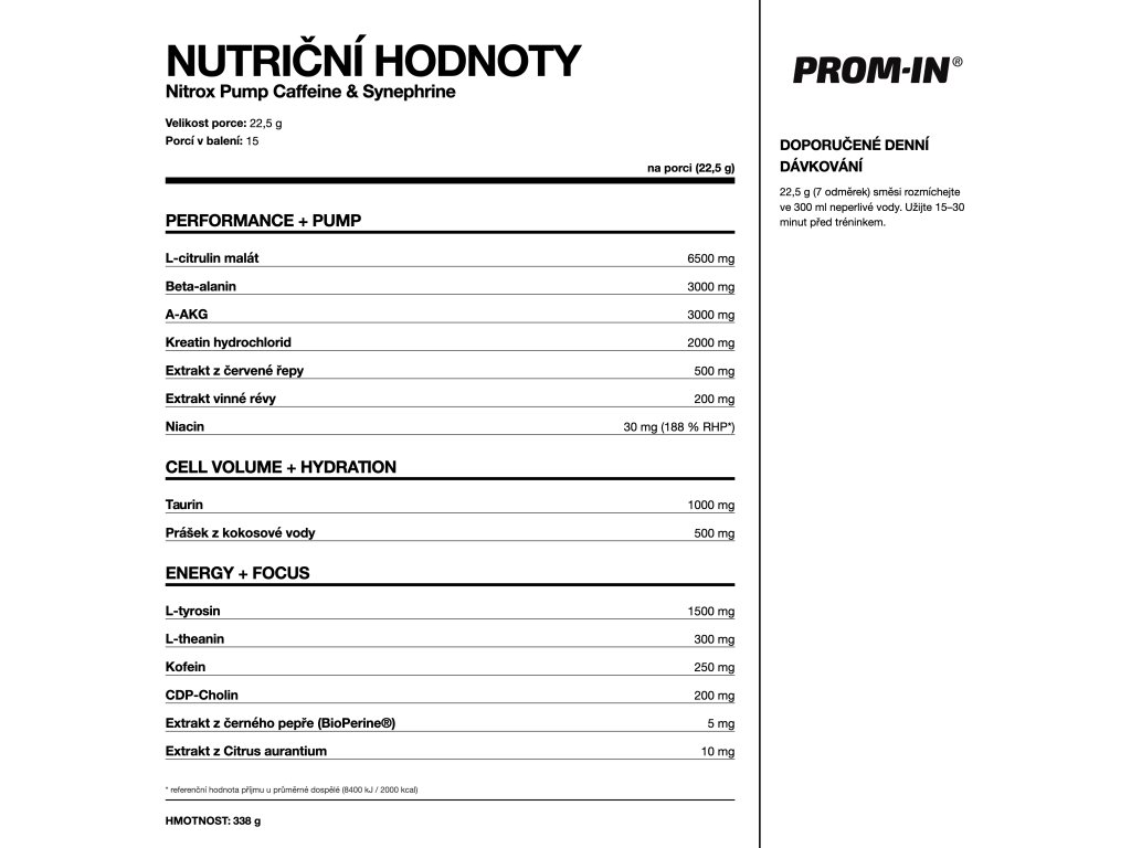 Nitrox Pump Caffeine+ je pre-workout pro sportovce, kteří dokážou v krátkém čase vytvořit brutální intenzitu a potřebují zajistit prostředí, které ten nápor vydrží. NITROX PUMP CAFFEINE+ Stojí na synergii citrulinu, A-AKG, beta-alaninu a kreatinu HCl, které vytvářejí podmínky pro nekompromisně tvrdé série. Neurofokus komplex (tyrosin, theanin, CDP-cholin) doplněný kofeinem a synefrinem podporuje pozornost a kontrolované řízení intenzity — bez přestimulace. Nitrox Pump Caffeine+ je navržený pro ty, kteří nepotřebují motivaci, ale nástroj, který jim umožní udržet maximální intenzitu