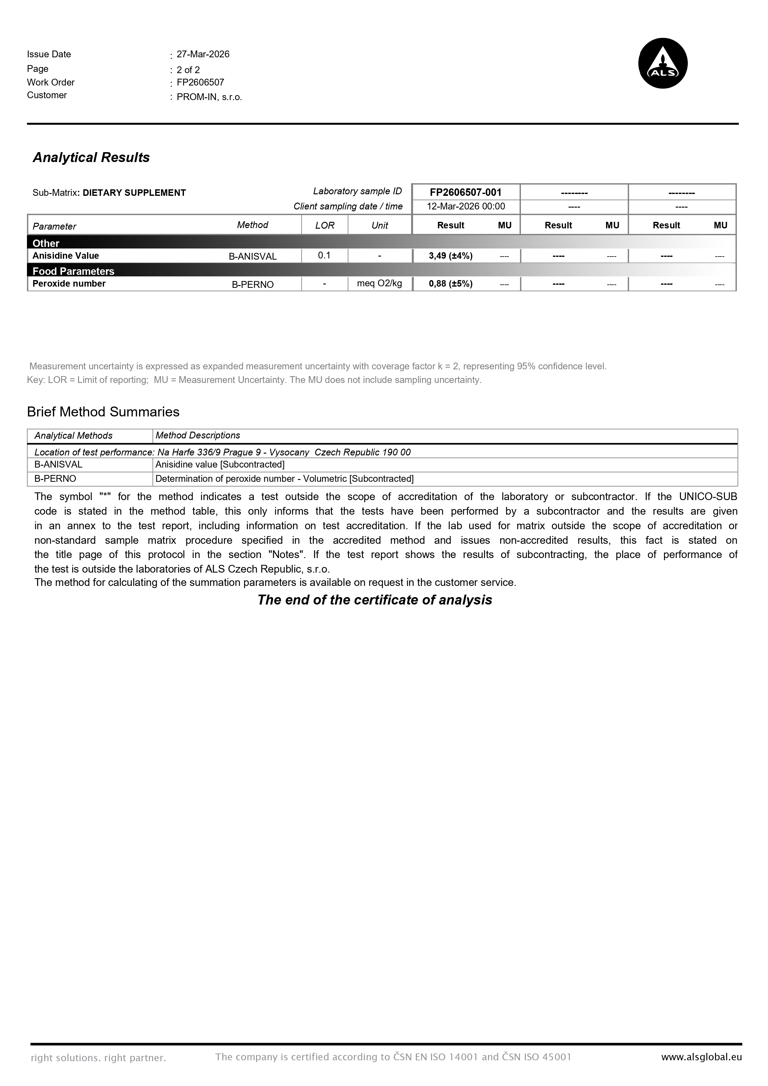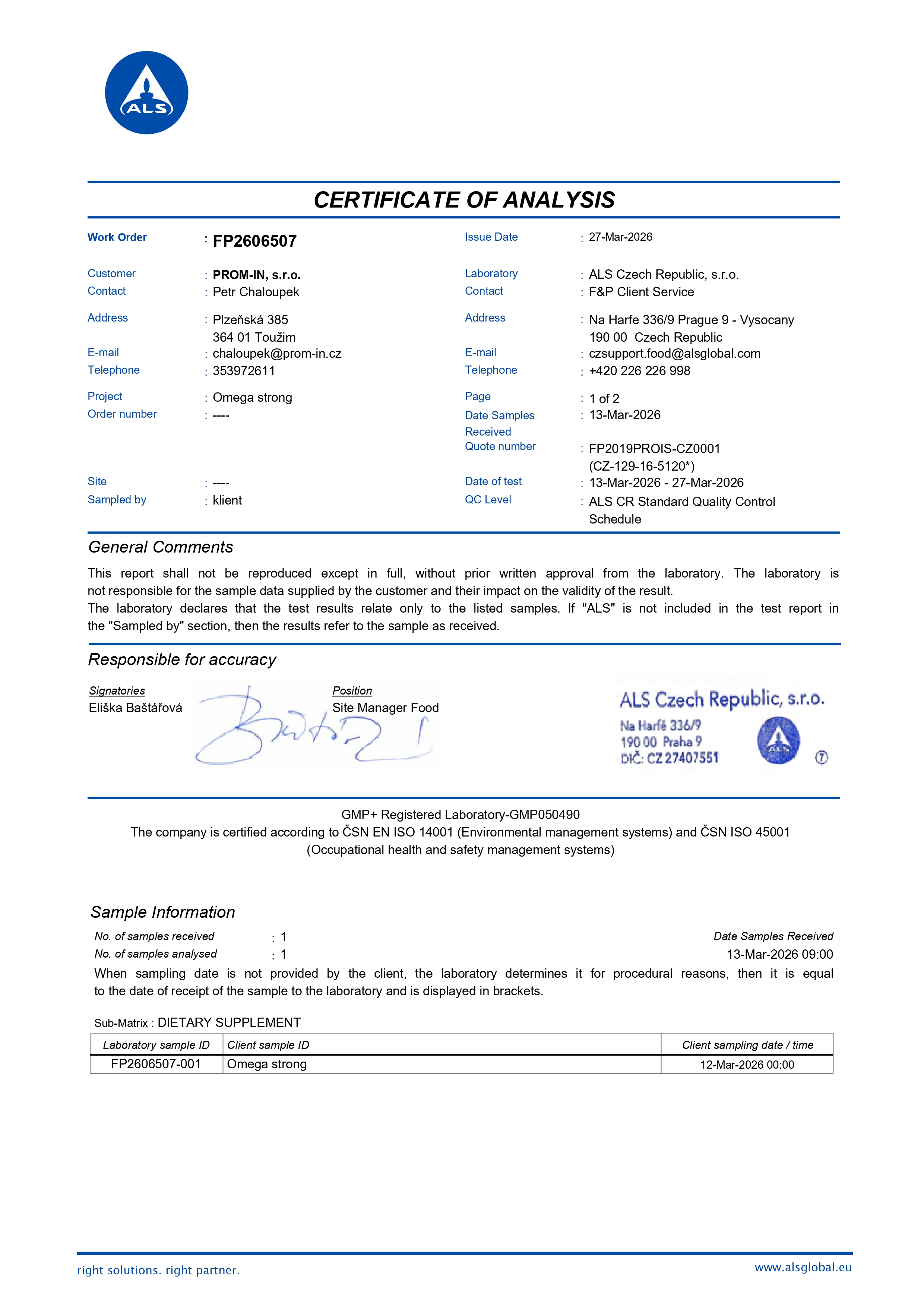 Vzorek oleje pro OMEGA 3-STRONG byl analyzován v nezávislé laboratoři ALS Czech Republic.
